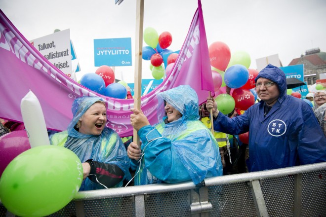 De finske fagforbunds opfordring til at nedlægge arbejdet fredag blev fulgt af omkring 300.000 medlemmer, og omkring 30.000 deltog i øsende regnevejr i demonstrationen i Helsingfors.