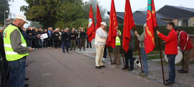 – Det er herinde jungleloven starter, konstaterede formanden for Byggefagenes Samvirke i København, Anders Olesen, da han talte til et par hundrede demonstranter morgenens demonstration på en stille villavej i Virum.