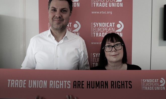 Den europæiske fagbevægelse appellerer til EU-parlamentet om at respektere de faglige rettigheder som menneskerettigheder ”Faglige rettigheder er menneskerettigheder” lyder sloganet